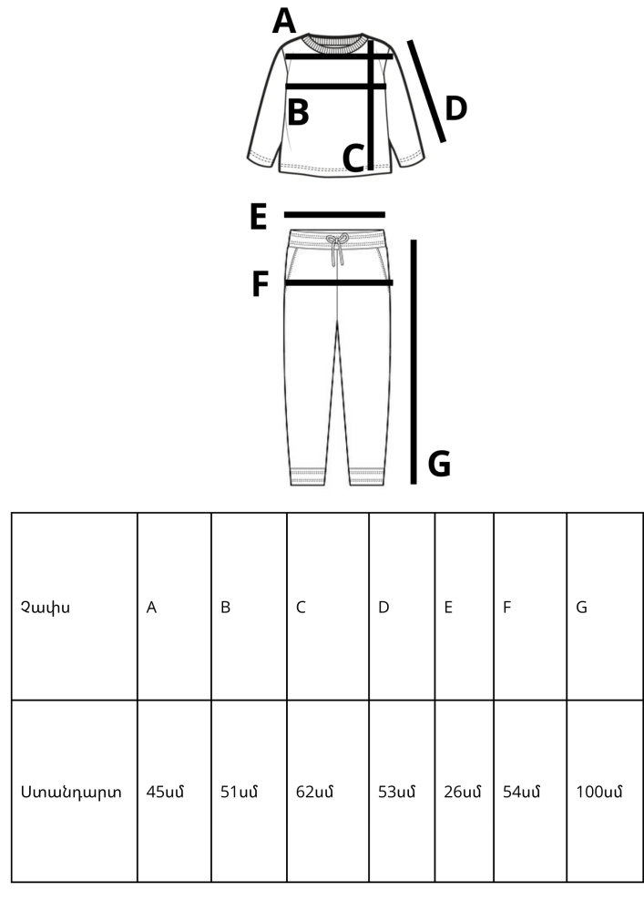| Ստանդարտ | 45սմ | 51սմ | 62սմ | 53սմ | 26սմ | 54սմ | 100սմ |